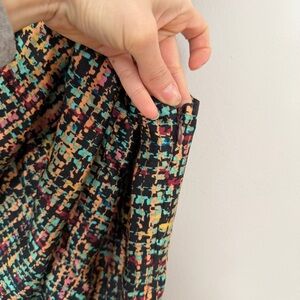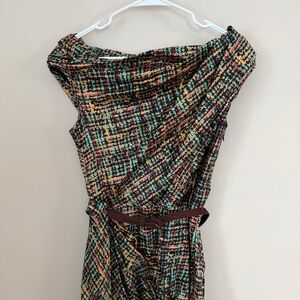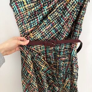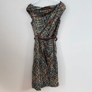 Striking Byron Lars Beauty Mark dress featuring an elegant draped shoulder silhouette and a rich multicolor tweed-inspired print. The painterly crosshatch design blends teal, coral, mustard, black, and cream tones, creating the look of textured woven fabric with the softness of a silk blend.