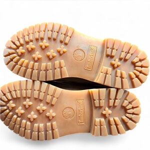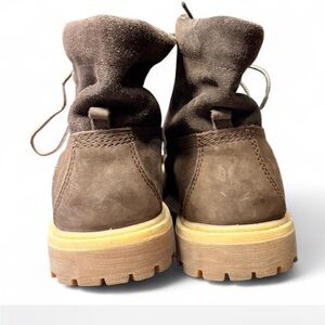 Timberland brown boot with floral patterned interior with tan and brown colors. Distinctive style for added flair.