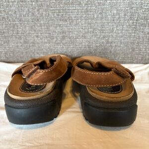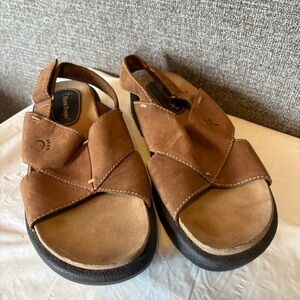 Details: adjustable hook and loop strap on back of heel, cushioned footbed, medium width, brown leather uppers, crosses across the top of the foot, open toe