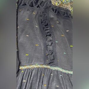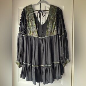V-neck - Long balloon sleeves - Back tie closure - Embroidered details - Inset ladder cutout trim - Tiered - Knit construction - Lined bust - Swing silhouette