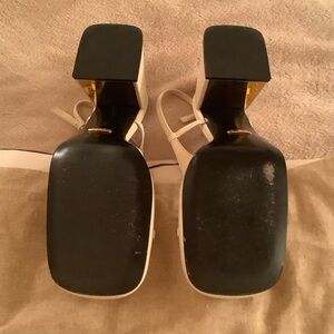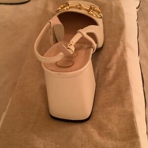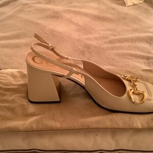 Chic Gucci flats in cream. Features elegant gold detailing. Perfect for versatile styling. Off white sling back. Square toe 3.5” heel
