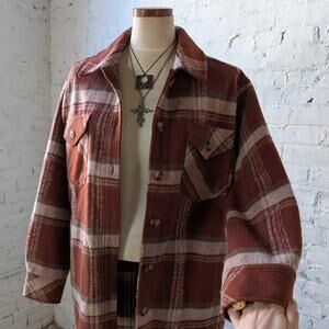 Retails $225+ sold out online! Nice thick cozy warm closet staple! Super cute longline oversized thermal flannel jacket in gorgeous rustic red plaid. 90s western grunge does hipster dark academia free people vibes. Muted earth tone hues, super soft fuzzed out flannel outer. Swirly button front closure, plenty of pockets! Longline silhouette with slouchy oversize fit, perfect for layers. Mid weight, perfect for layering. Gently used, in excellent condition.