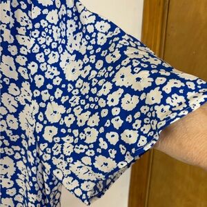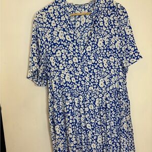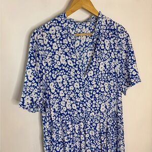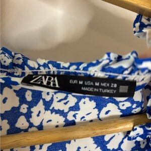 Chic floral midi dress by Zara. Features a vibrant blue and white pattern, ruffle neck and flutter short sleeves. Excellent condition. Size M, oversized fit. (S)