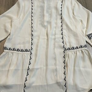 Elegant blouse featuring intricate black embroidery. Perfect for any occasion.