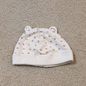 Adorable cream-colored baby beanie featuring a cute yellow bee print and soft folded cuff. Lightweight, cozy, and perfect for keeping little ones warm and comfortable.