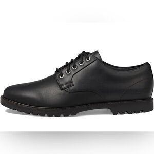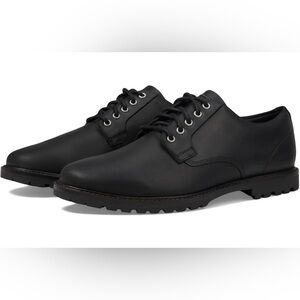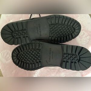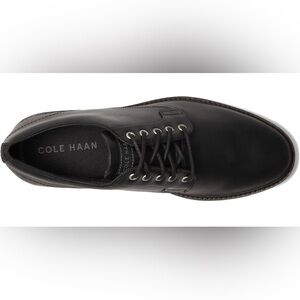 Mens Cole Haan Oxford shoes with plain toe design. Features water-resistant full-grain oiled leather upper, leather finishing, and heavier stitch detailing. Textile lining and EVA insole with extra midsole cushioning for comfort. Waxed lace ties and slight block heel.