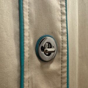 Coach Turnlock Trench Coat, notable for its beige exterior and vibrant multicolor pop-dot (polka dot) lining