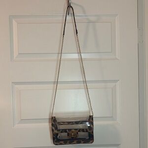 Clear Crossbody bag w/leopard print trim gold chain strap, stadium-approved