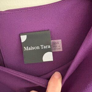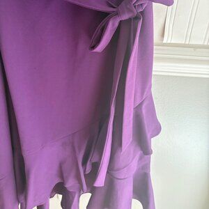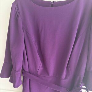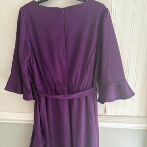 High round neckline, elbow length bell sleeves, ruffled hem, back zip closure, polyester/spandex blend