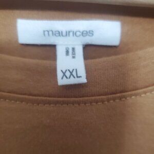 Relaxed fit, crewneck, short sleeves, slits on each side of hem at the bottom, graphic print on top part of shirt, 60% cotton, 40%polyester, machine washable, butterscotch tan color. Women's size XXL. New without tags
