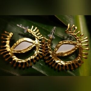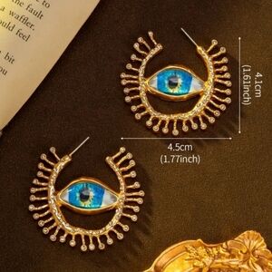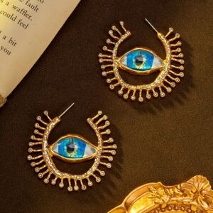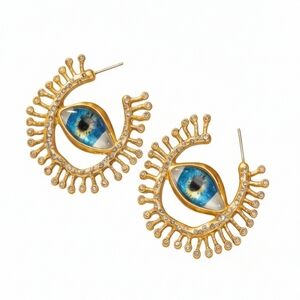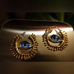 Stunning gold and blue eye Schiaparelli stamped motif earrings. Perfect for adding a unique touch to any outfit.