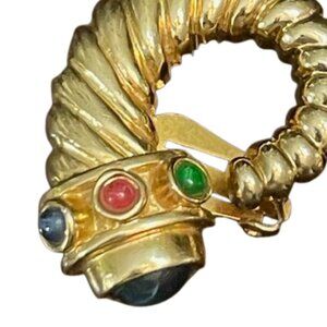 Vintage 80's mogul style clip earrings featuring a twisted gold tone rams horn or scallop/shrimp design with glass cabochons in blue, green and ruby red. Unsigned, are marked with "L" and "R" for left and right. Large Gold tone bold mogul style ribbed shrimp/scallop design. Classic 80's statement style, high polished gold tone.