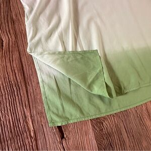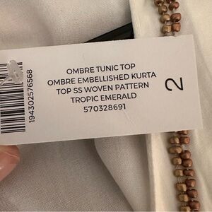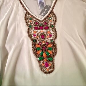 Gorgeous top, with embellishments; colorful beading at chest. Emerald green and white ombre coloration. Perfect for vacation, traveling, resort wear, or summer time activities. Lightweight rayon fabric, and so flattering!