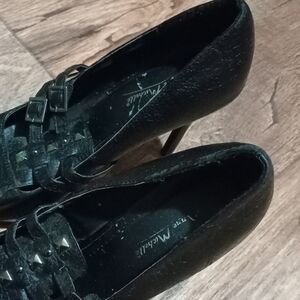 Elegant black heels with bold stud accents. Perfect for a stylish, edgy look. date nights formal office wear has minor flaws peeling on the sides preowned