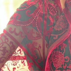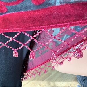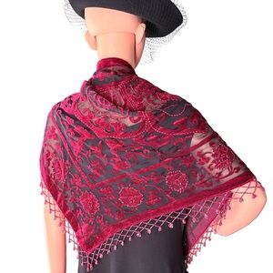 Vintage circa 1999 tango shawl featuring rich red velvet flocking over sheer black mesh, finished with dramatic hand-beaded fringe.