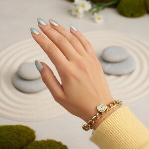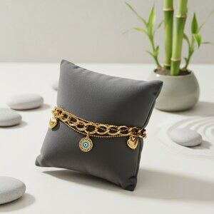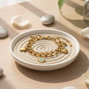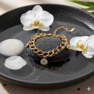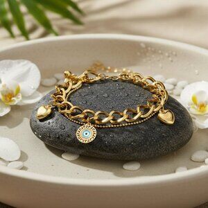 18K gold plated bracelet, stainless steel bracelet, double chain bracelet, chunky chain bracelet, heart charms bracelet, evil eye charm bracelet, adjustable bracelet, gold chain bracelet, trendy bracelet, fashion jewelry, hypoallergenic bracelet, tarnish-resistant bracelet, gold charm bracelet, evil eye jewelry, gold heart bracelet, women's jewelry, statement bracelet, luxury bracelet, gold bracelet for women, stylish bracelet, designer bracelet, boho chic bracelet, protective jewelry, evil eye accessory, gold plated stainless steel, durable jewelry, charm bracelet, cute