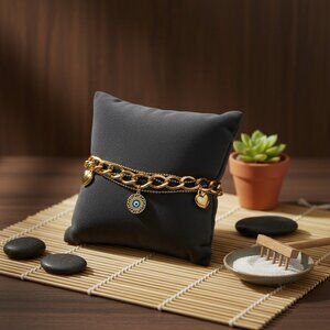 This stunning 18K gold plated stainless steel double chain bracelet combines elegance and protection. The chunky chain design features two heart-shaped charms and a radiant evil eye pendant, offering a chic blend of style and meaning. The bracelet is adjustable for a comfortable fit and crafted to last, perfect for any occasion!