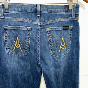 "These are pre-owned 7 For All Mankind 'A Pocket' flare jeans in a blue wash, size 26. They feature distinctive gold \"A\" stitching on the back pockets and gold contrast stitching throughout. The jeans have a classic five-pocket design with bronze-toned hardware. Made in Mexico, the fabric blend includes 2% spandex for stretch. The denim shows light fading consistent with gentle wear, but no significant imperfections are visible."