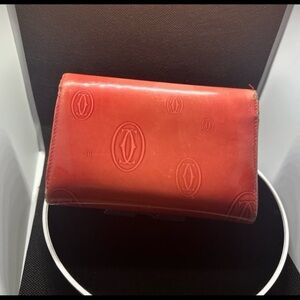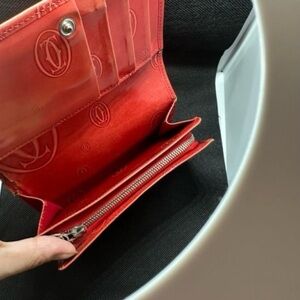 Elegant red patent leather wallet featuring an allover embossed Cartier motif. Classic snap-closure design with multiple card slots and a zippered coin compartment for organized everyday use.