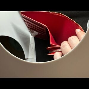 The glossy patent finish gives it a polished look, while the interior offers ample storage for cards, cash, and coins. A timeless designer accessory in a bold red color.