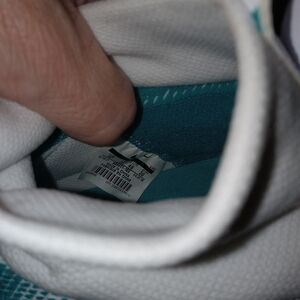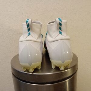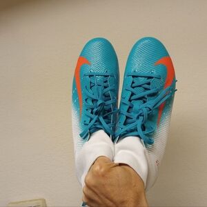 Size 12.. color white & aqua green like miami dolphins...Never used,---no wear signs---been in closet for 6 or 7 year, any signs would be age related only.. nothing to mention(as shown),bought for nephew years ago.....he was suppose to play football-he got in trouble in school an was never able to play -hence -he never got the shoes...Awesome ones !!! Enjoy TY !!
