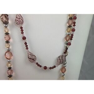 Art Glass Beaded Long Necklace Plum Mauve Swirl Teardrop Faceted Crystal Silver