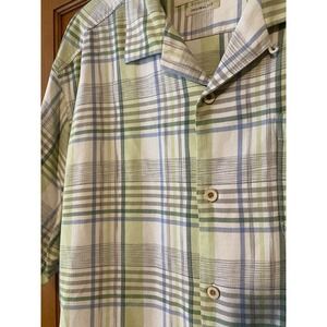 Tommy Bahama Shirt Men XL Plaid Silk Blue Green Wood Buttons Vtg Button Down