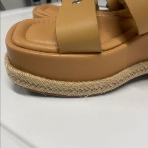 Stylish Dolce Vita platform sandals. Features tan straps with buckle details. Comfortable and chic design.