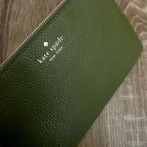 Elegant leather pouch in forest green by Kate Spade. Ideal for daily essentials.