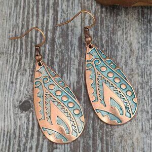 boho, earrings, drop leaf earrings, teal and copper, green metal, copper alloy, boho jewelry, festival wear