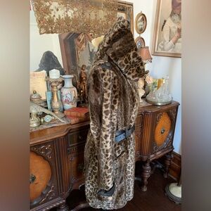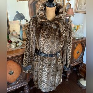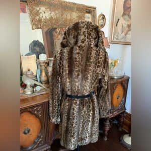 Vintage Most Amazing Sexy Classy Boho Soft Faux Fur Leopard Print High Collared Fall Winter Coat with Faux Leather Details, Antiqued Brassy Buttons and faux leather Belt. One of the most beautiful vintage faux furs that I have come across!!