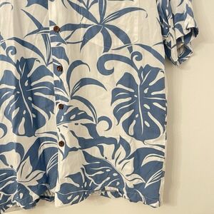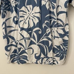 Classic vintage Hawaiian aloha shirt by Kalaheo, proudly made in Hawaii, USA. This men's short-sleeve button-up features a timeless blue and white tropical leaf print with a relaxed island fit. Crafted from lightweight 100% rayon, it drapes beautifully and feels breathable—perfect for warm weather, vacations, or laid-back summer styling.