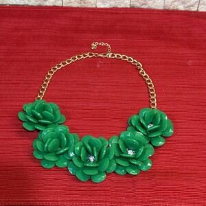 VTG Gold Tone Statement Green Bib Flower Necklace W/Rhinestone Center & Extender