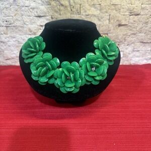 This Vintage Gold Tone Statement Green Bib Flower Necklace features 5 stunning green flowers with a rhinestone center and extender. The necklace has a lobster closure and a chain style, making it a bold statement piece for fashion and costume accessories. The nature-themed design with flower elements adds a touch of elegance to any outfit, while the use of crystal as the main stone adds a touch of glamour. Perfect for those who appreciate unique and eye-catching jewelry pieces.