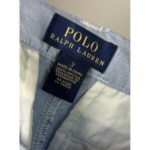 This product is a pair of Polo Ralph Lauren blue chino shorts for boys in size 7. Made from 100% cotton twill fabric, these shorts feature a solid pattern and flat front design. They are suitable for casual occasions and come with adjustable waist and pockets for convenience. The classic preppy style of Polo Ralph Lauren makes these shorts a versatile option for various activities such as walking, school, golfing, or skateboarding during the summer, fall, and spring seasons.