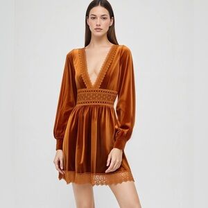 CIDER VELVET PLUNGING V-NECK BOHO CROCHET LACE TRIM BABYDOLL MINI DRESS - xl