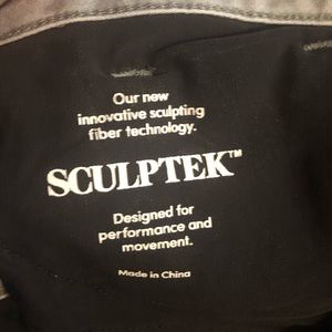 This is a pair of light gray, SculpTek jeans from Athleta. These are a size 8 and material makeup is 65% cotton, 33% polyester, and 2% spandex. They are a skinny cropped jean. Light gray. They measure: 34 inches long, 26 inch inseam, and 14.5 inches at waist when lying flat. 9 inch rise.