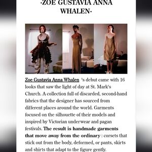 after starting her eponymous label in 2022, zoe continues to release seasonal collections off calendar during new york fashion week. her work has been recognized by major publications such as vogue, purple, high snobiety, dazed, cultured, the cut, the new york times, and more.
