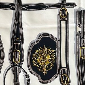 Designer: This pattern was designed by Marie-Françoise Héron.Original Issue: The design was first released in 1966.Motif: The design features a meticulous display of various equestrian harnesses and bridles, reflecting the brand's origins in saddlery.Dimensions: It is a standard "Carré 90," typically measuring approximately 90cm x 90cm (roughly 35 x 35 inches).Material: It is crafted from high-quality silk twill.one owner