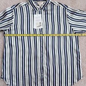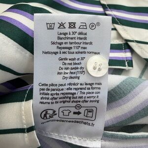 This shirt is brand new with original tags and no flaws. It's a gorgeous green, purple and off white stripe, collared neckline and button down closure with button closure at wrists as well. Shirt is a US size 2, please see all measurements show in the pictures to determine fit. Material is 100% viscose with satin feel.