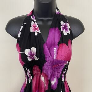 Vtg Black Pink Hibiscus Flower Halter Dress Hawaiian Y2K Babydoll Fairy Sz M.