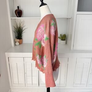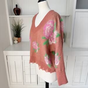 - rusty blush wool blend with textured floral roses, stretch knit, ribbed trim, drop shoulder, V-neck, distressed hem, oversized fit