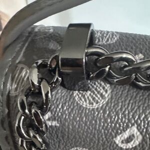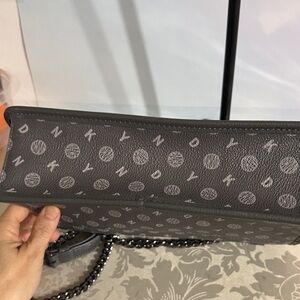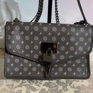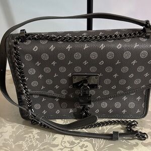 Stylish DKNY shoulder bag with iconic monogram. Sleek black design. Perfect for any outfit.