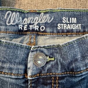 Stylish Wrangler Retro Slim Straight Medium blue jeans with a slim straight leg design. Durable and versatile for everyday wear. Very good Used Condition