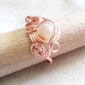 The focal bead is a honey colored, frosted Dragonvein Agate that has some tan inclusions. The bead can be gently rotated on the ring, to bring up and showcase the side you like best. This is a irregular and asymmetrical ring, with loads and loads of natural copper wire used in the organically vined band as well as on top of the ring base. It reminds me a bit of a stylized "Eye of Ra" plus added swirling and curling to securely protect the bead. I really like how this turned out, and will play with that "eye" design in some of my next pieces to see if I can't make it appear more eye like as it already is...