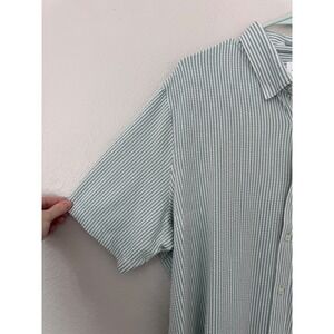 Keywords: 7 Diamonds, Mens Shirt, XL Shirt, Striped Shirt, Short Sleeve, Seersucker, Casual Shirt, Button Up, Mens Top, Green Shirt, White Stripes, Summer Fashion, Breathable Fabric, Everyday Wear, Comfortable Fit