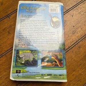 The Land Before Time X: The Great Longneck Migration on VHS brings the tenth installment of the beloved prehistoric series to your home media collection. Littlefoot and his grandparents embark on a journey following a mysterious "sleep story," leading them to a massive gathering of dinosaurs and a surprising family discovery. This 2003 Universal Studios release features an impressive voice cast including Kiefer Sutherland, Bernadette Peters, and James Garner, along with an original song by Olivia Newton-John. The tape is housed in its original white clamshell case, perfect for fans of classic animation and dinosaur adventures.
