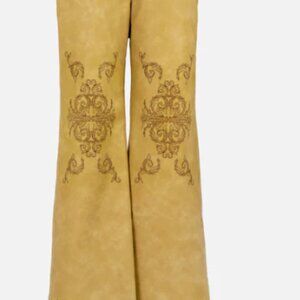 Seba Pants, a luxury straight leg pant in Sand suede leather. Designed to sit at the mid-waist elevated with baroque style embroidery at the waist, knee, and hem.
