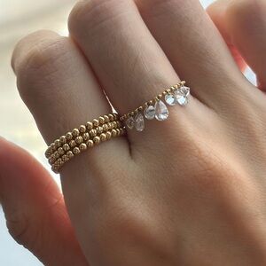 The diamonds are suspended along a fine gold bead chain, creating a soft “dancing” effect — lightweight, elegant, and perfect for stacking or wearing alone. The sliding adjustable design allows comfortable fit across multiple finger sizes.