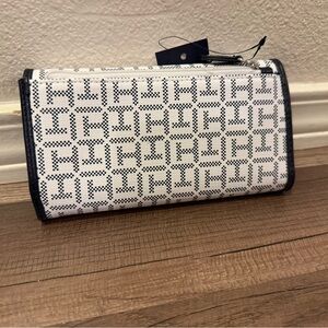 Chic Tommy Hilfiger wallet with monogram pattern. Sleek black trim adds elegance.